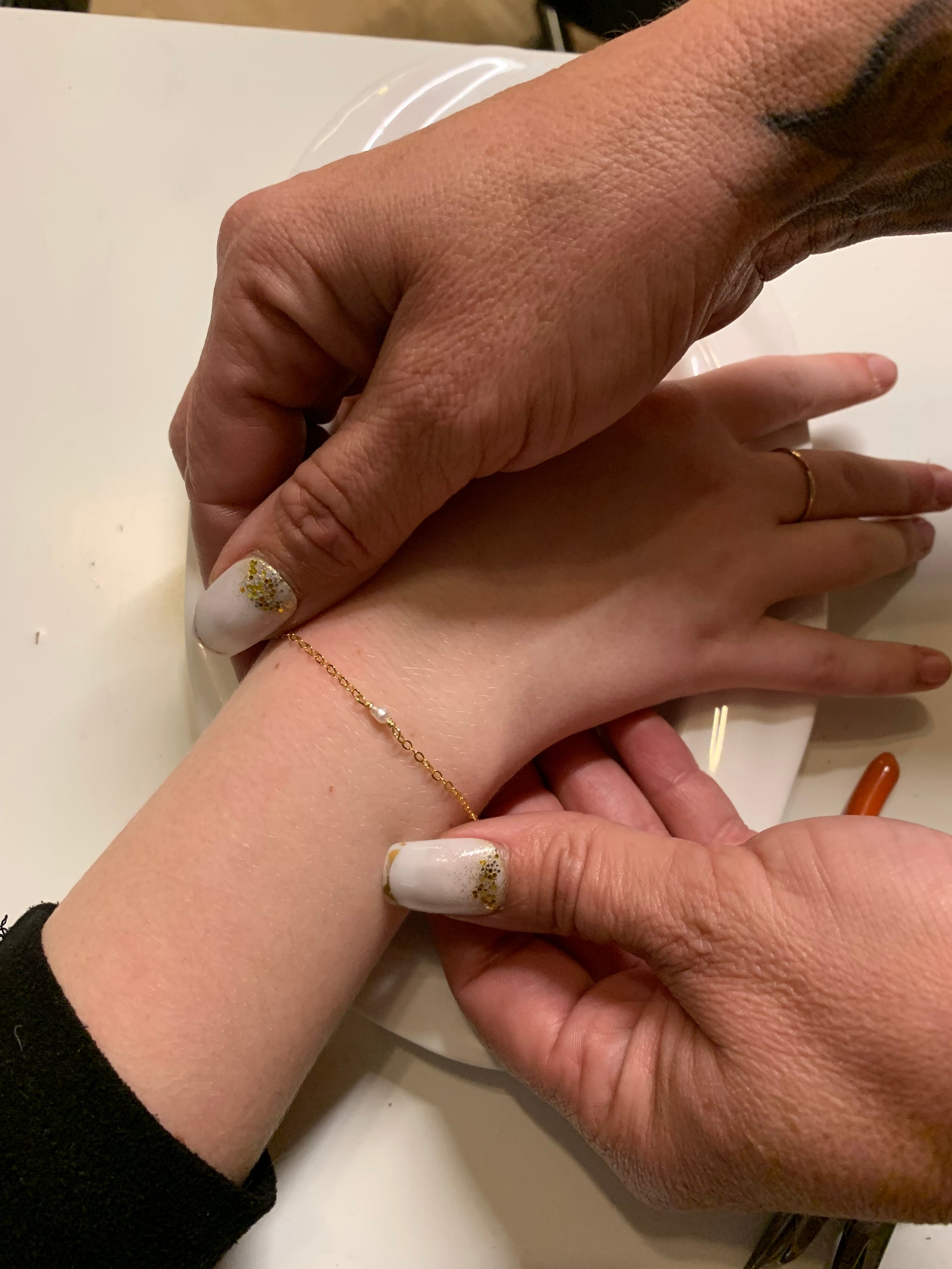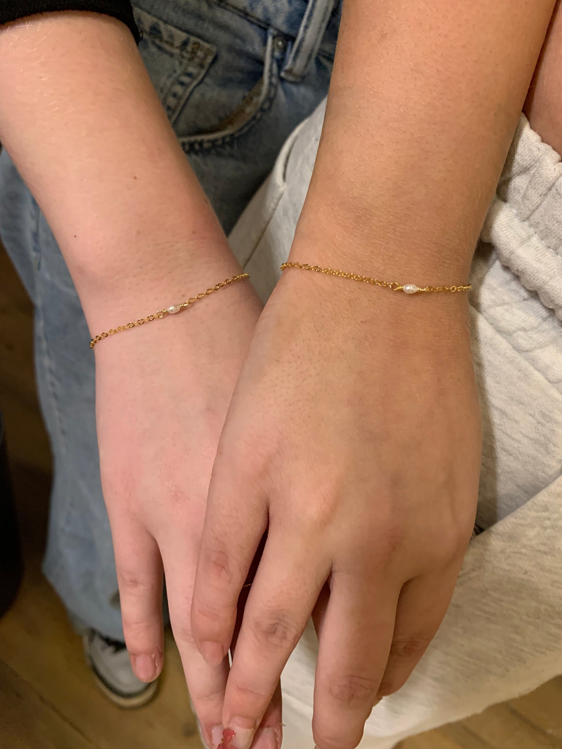Fremstillet i forgyldt 18 karat sterlingsølv og dekoreret med en diskret ferskvandsperle, repræsenterer hvert armbånd et unikt bånd – mellem kærester, veninder, søstre eller som et symbol på selvkærlighed.