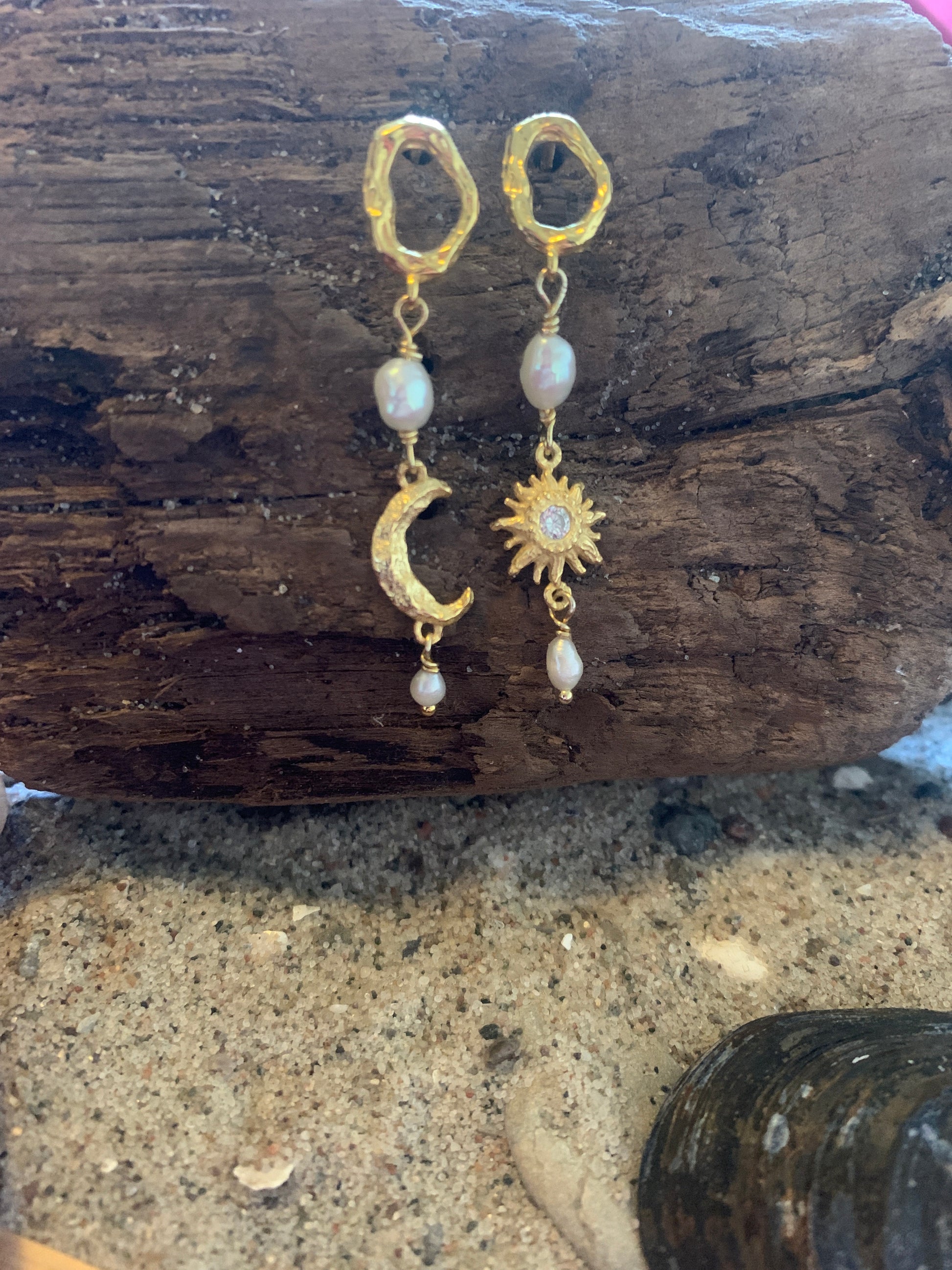 Hver detalje er nøje udvalgt: ægte ferskvandsperler, et elegant vedhæng formet som sol og måne – et symbol på balance, feminine kræfter og indre ro.