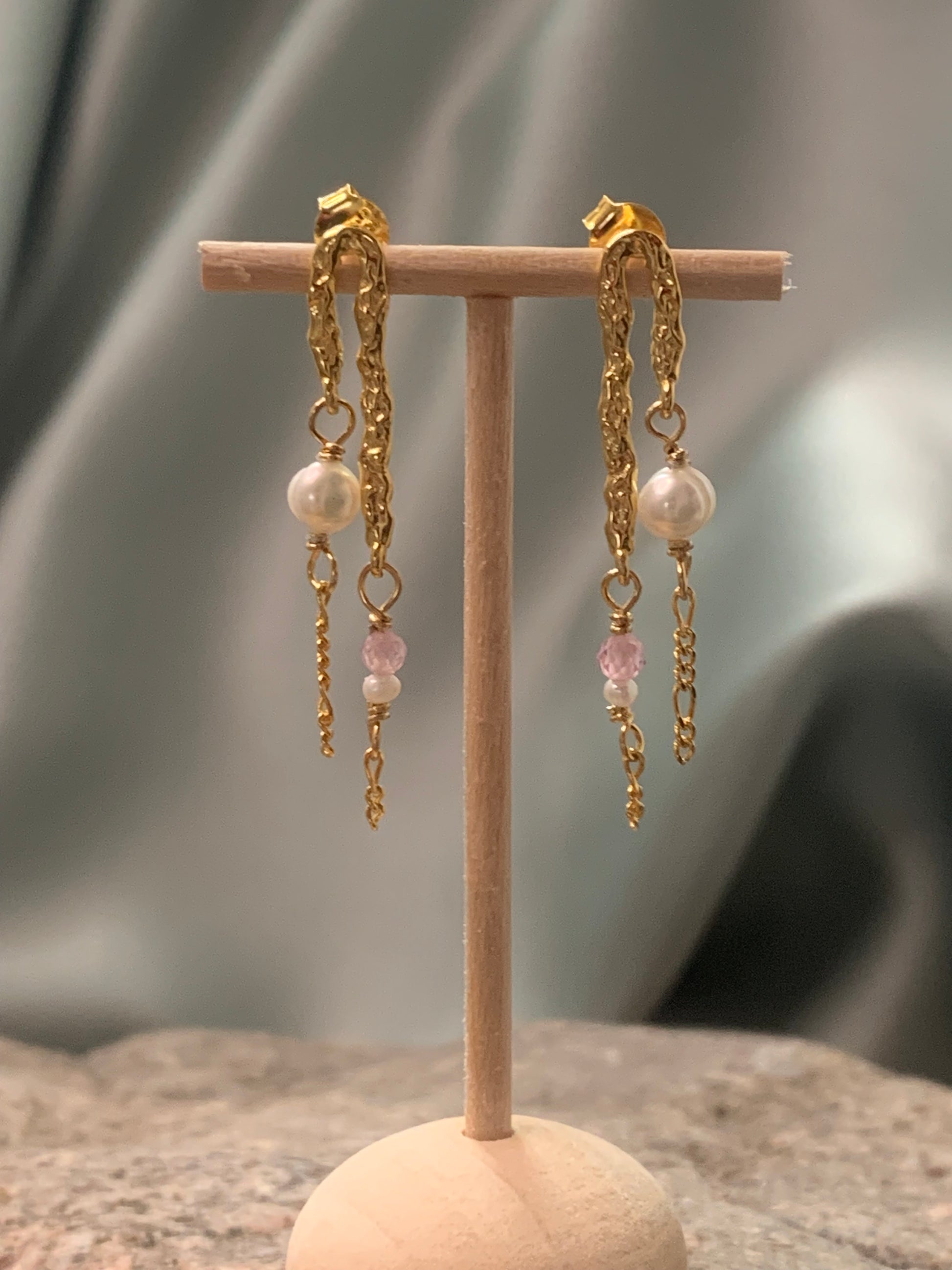 Disse delikate øreringe er skabt til den moderne kvinde, der værdsætter luksuriøse detaljer og unikt design. Hver ørering er smukt sammensat af ægte ferskvandsperler og fine halvædelsten, som sammen skaber et sofistikeret og feminint udtryk.