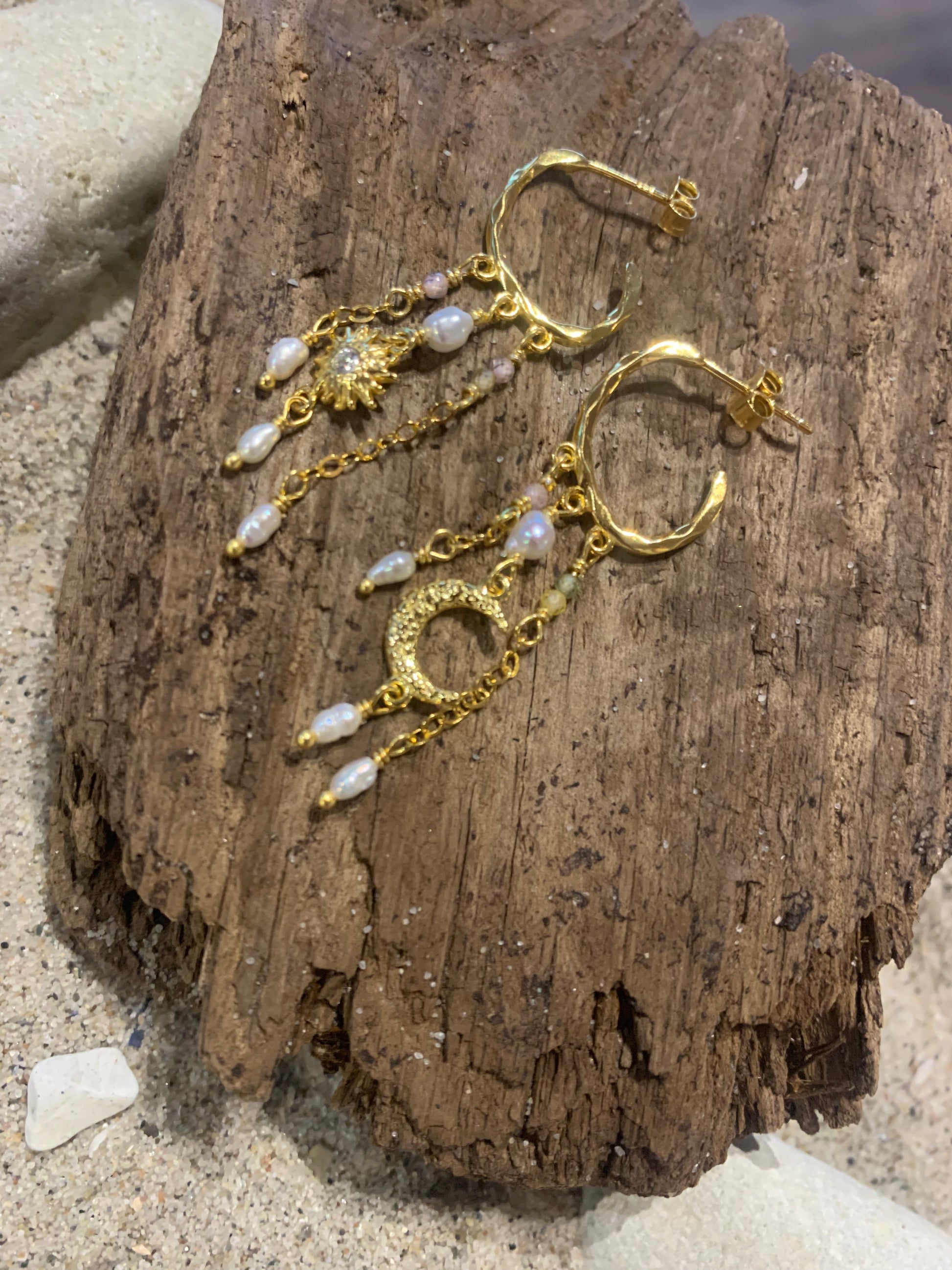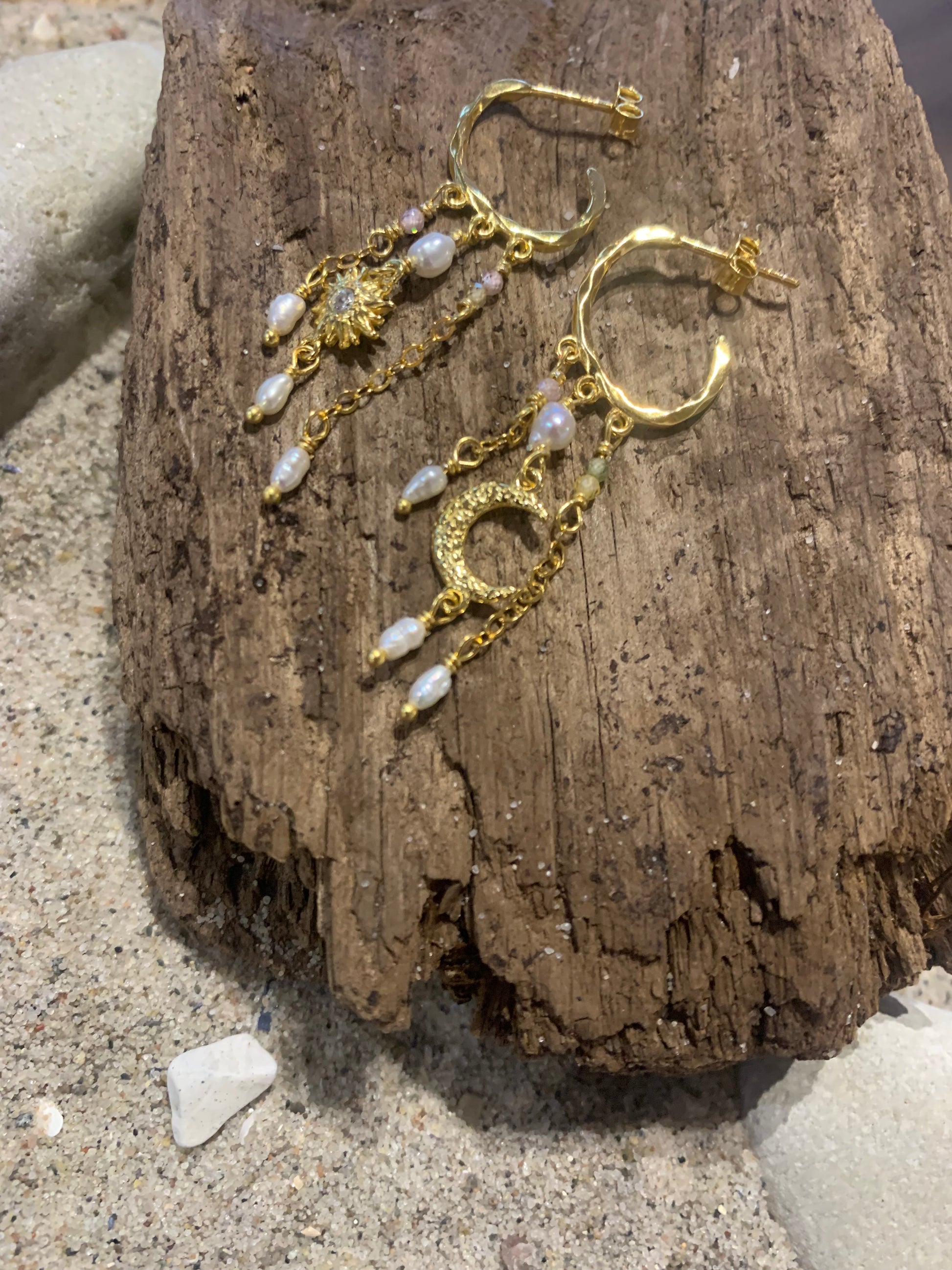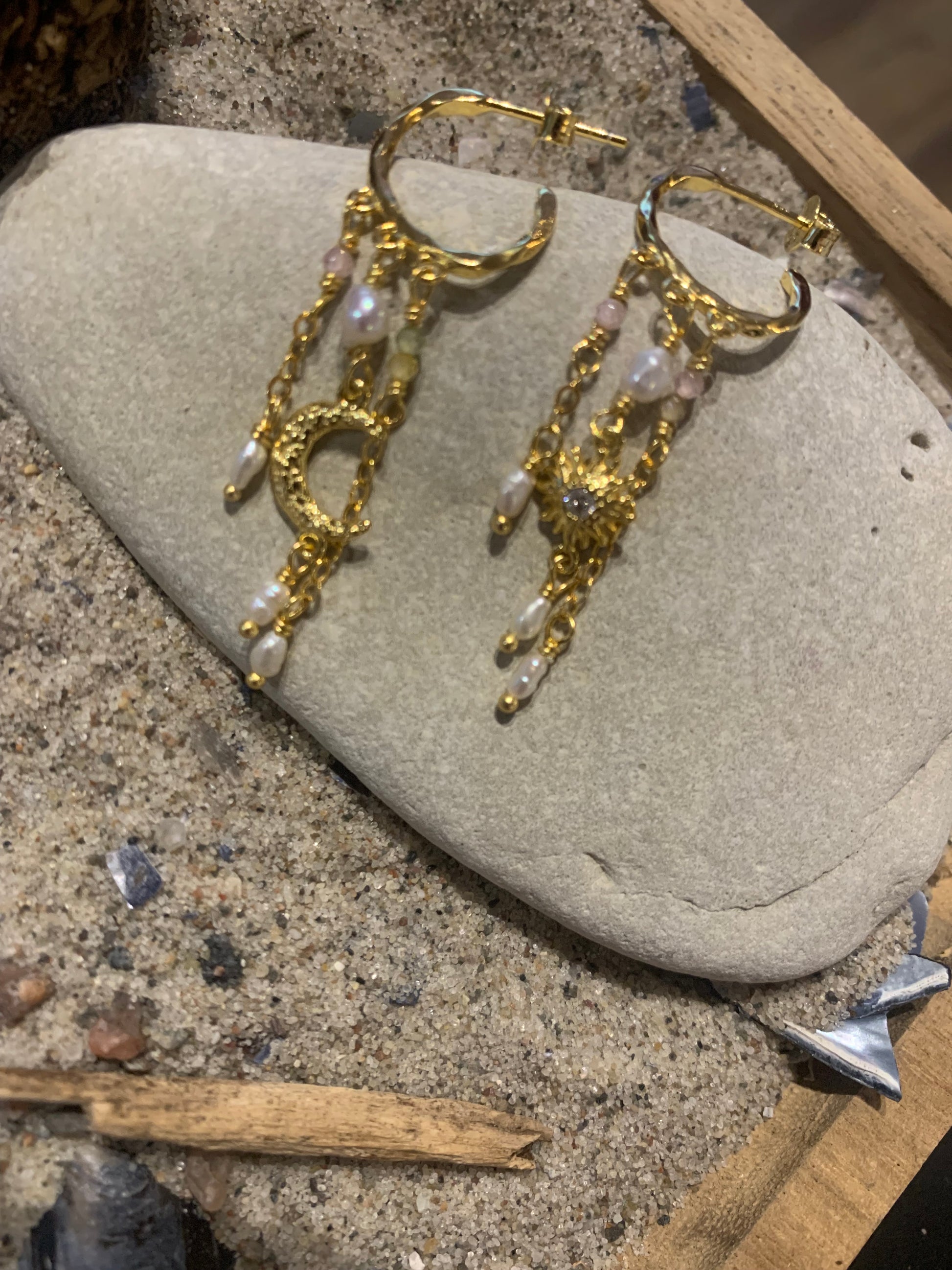Hver perle og sten er nøje udvalgt, så farvespillet og glansen harmonerer smukt med de fine kæder og de karakteristiske sol- og månevedhæng. Det gør Cirena til et unikt håndlavet smykke i ægte dansk design – et smykke, der bevæger sig let og fanger lyset ved selv den mindste bevægelse.