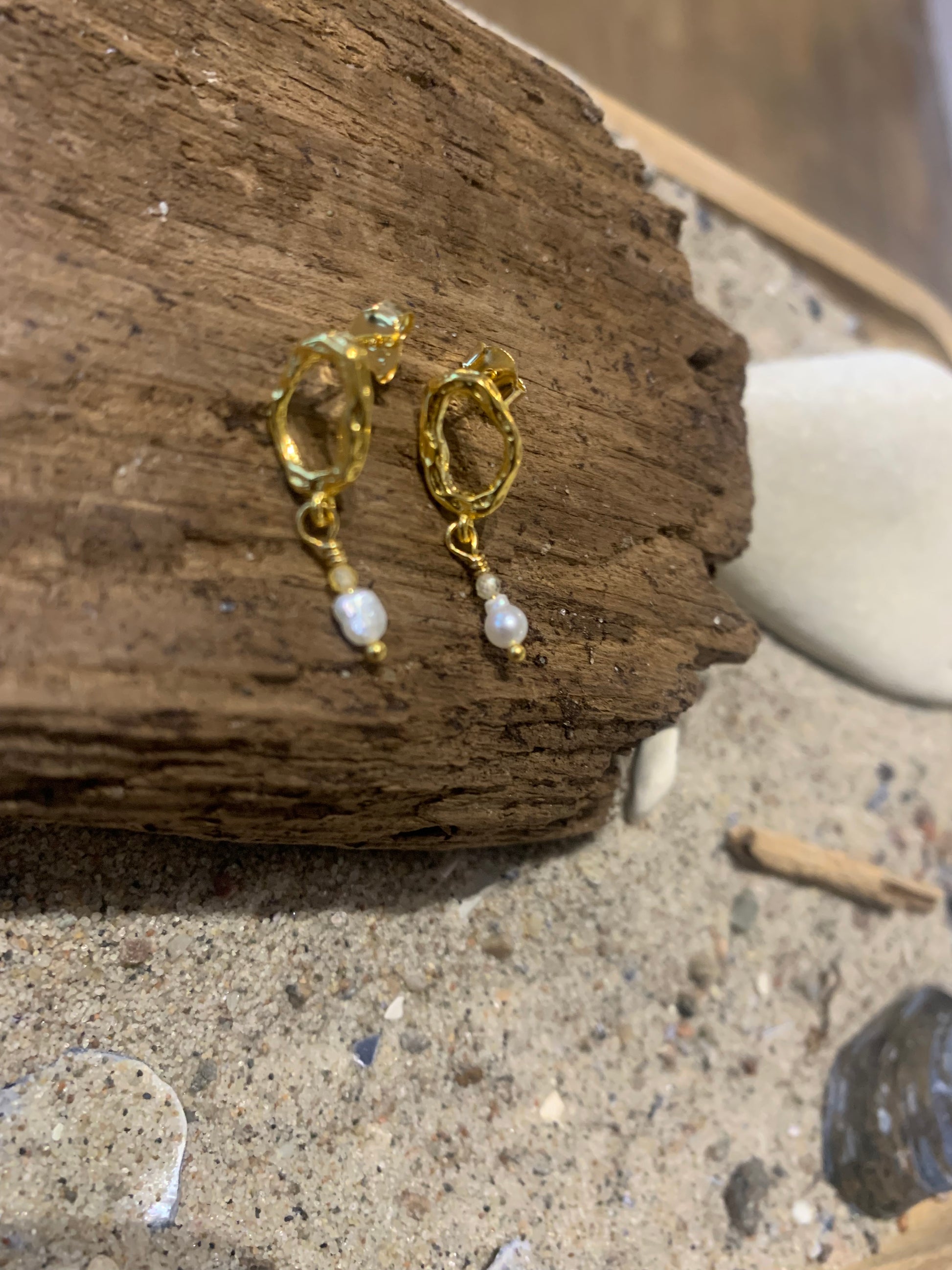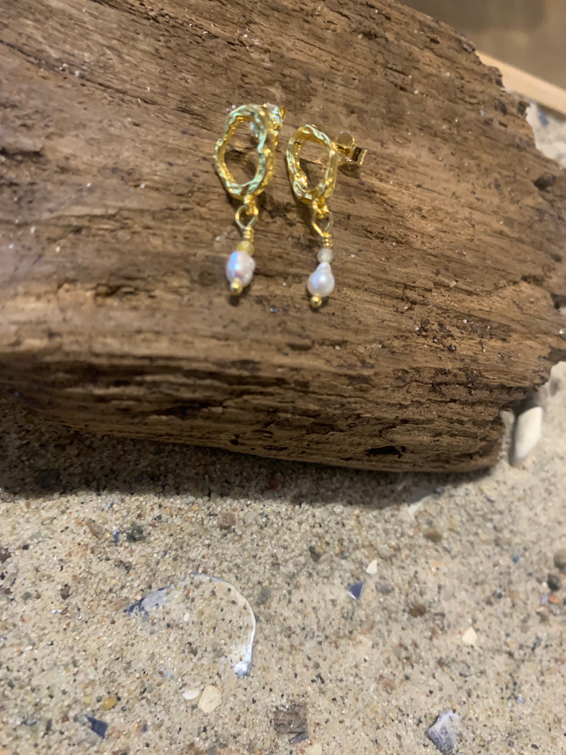 Lad mig præsentere Elara – et par elegante, håndlavede øreringe skabt til kvinden, der udstråler ro, styrke og naturlig skønhed. De fine detaljer i forgyldt 18 karat sterlingsølv fremhæver den bløde glød fra de små ferskvandsperler, som giver et feminint, luksuriøst touch til ethvert look.