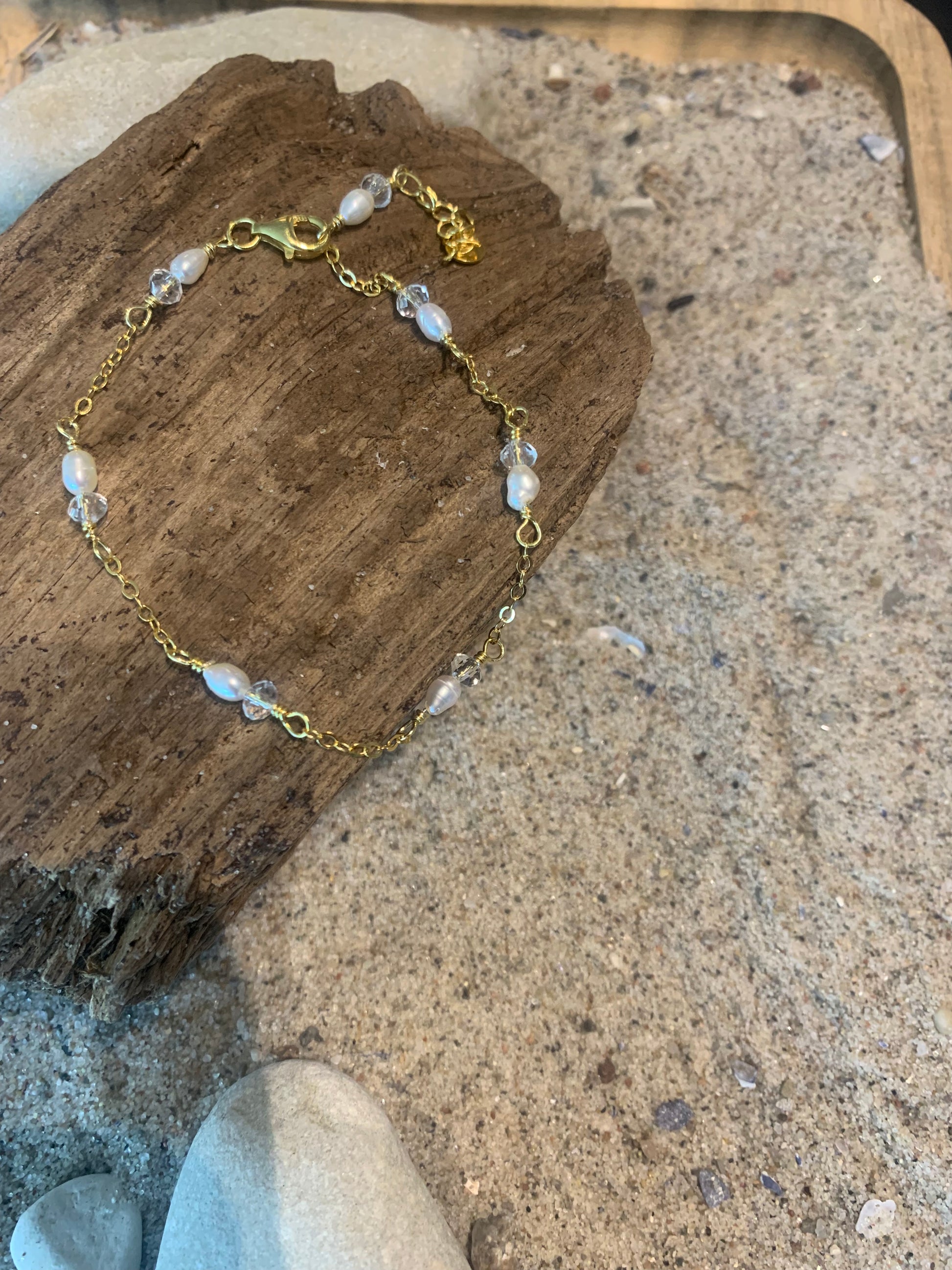 Elowen er et håndlavet armbånd fra Gems4You, skabt i et let og feminint design, hvor fine ferskvandsperler møder klare facetterede glasperler, som reflekterer lyset smukt. Armbåndet er sammensat med en delikat kæde i forgyldt 18 karat sterlingsølv, der tilfører et eksklusivt og tidløst udtryk.