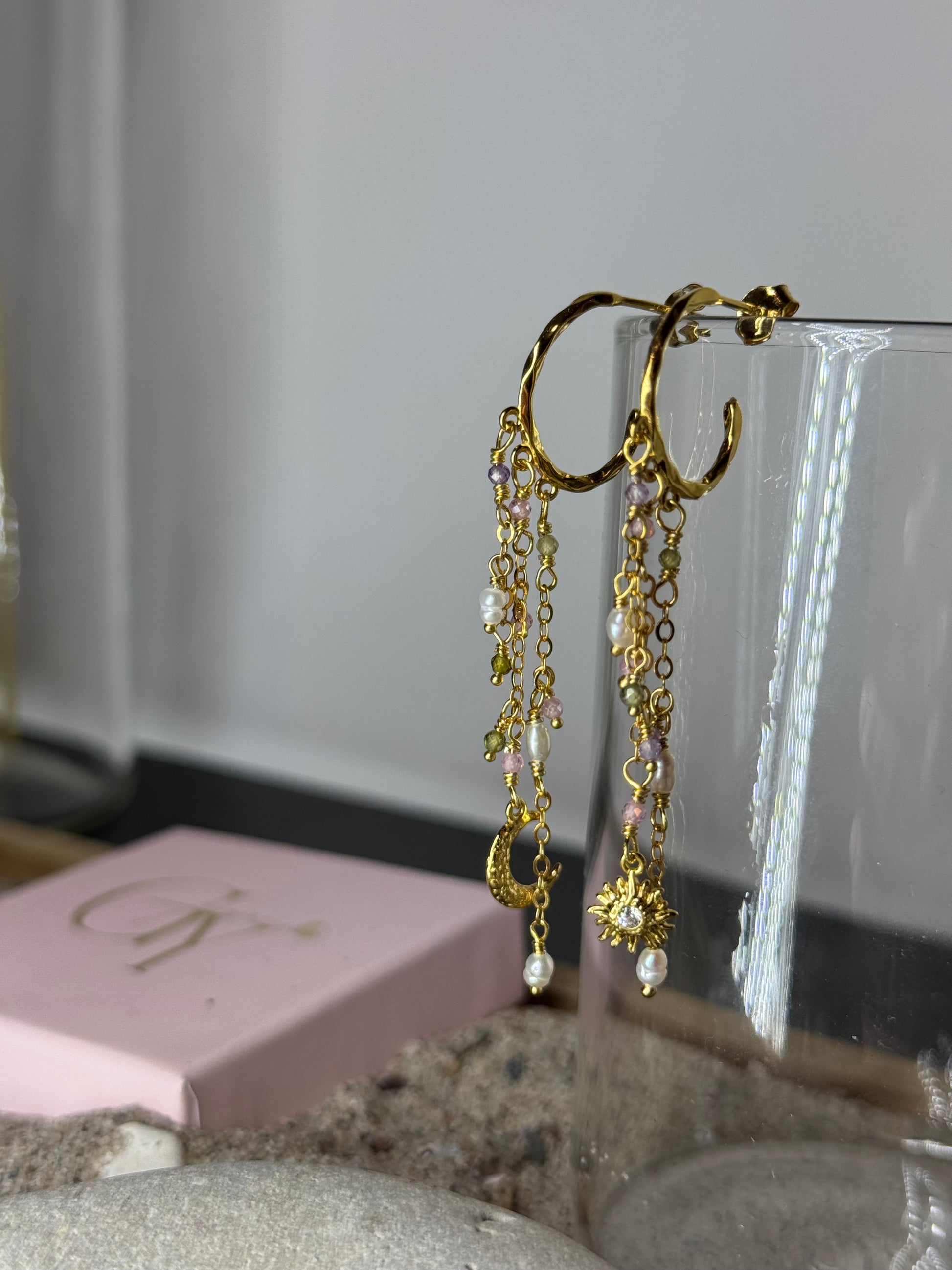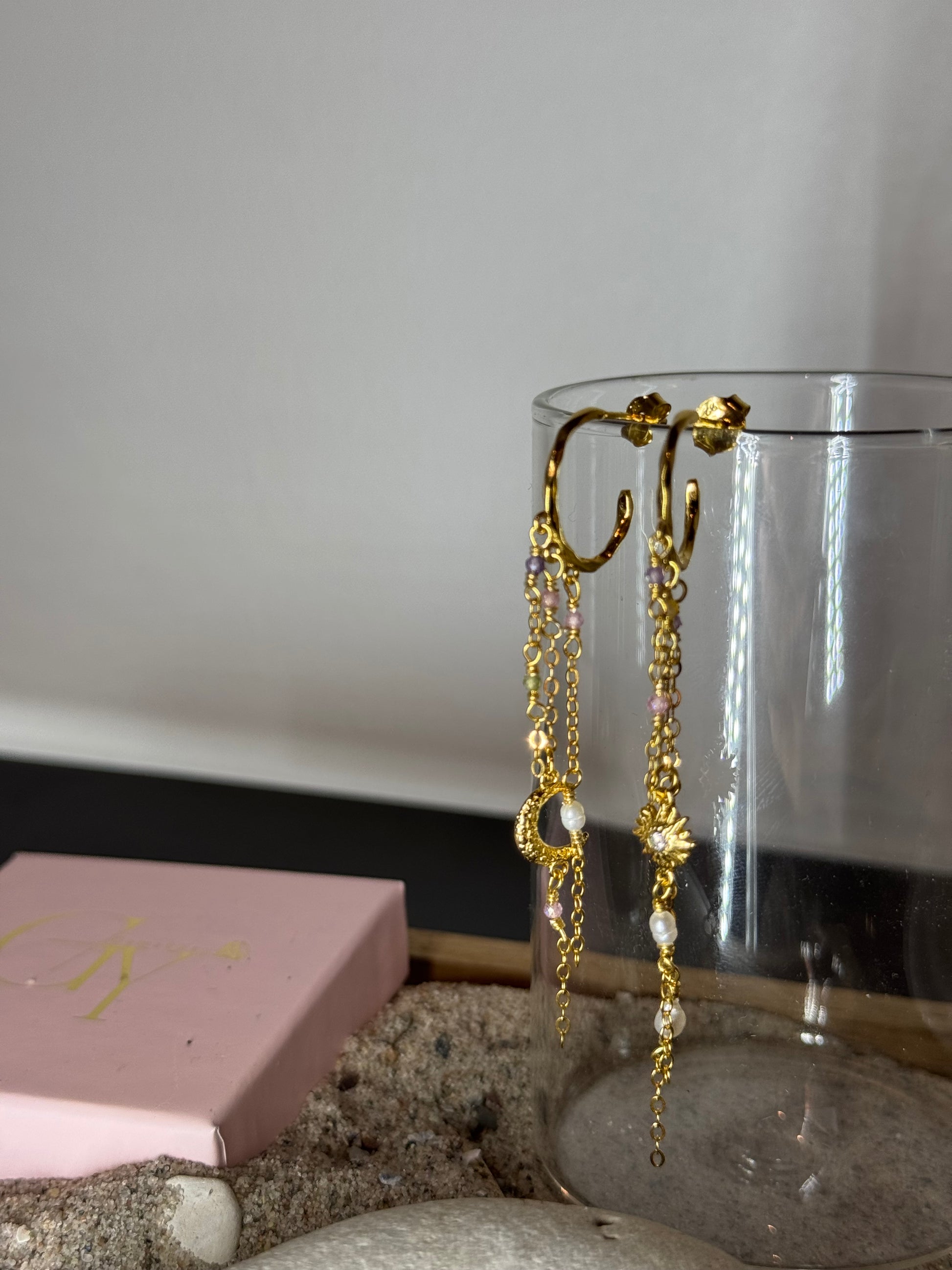 Lunaria er skabt til kvinden, der elsker et smykke med drømmende bevægelse og magisk glans. Disse håndlavede kædeøreringe er udført i forgyldt 18 karat sterlingsølv, hvor hver lille detalje er valgt for at skabe et let, luksuriøst og eventyrligt udtryk.