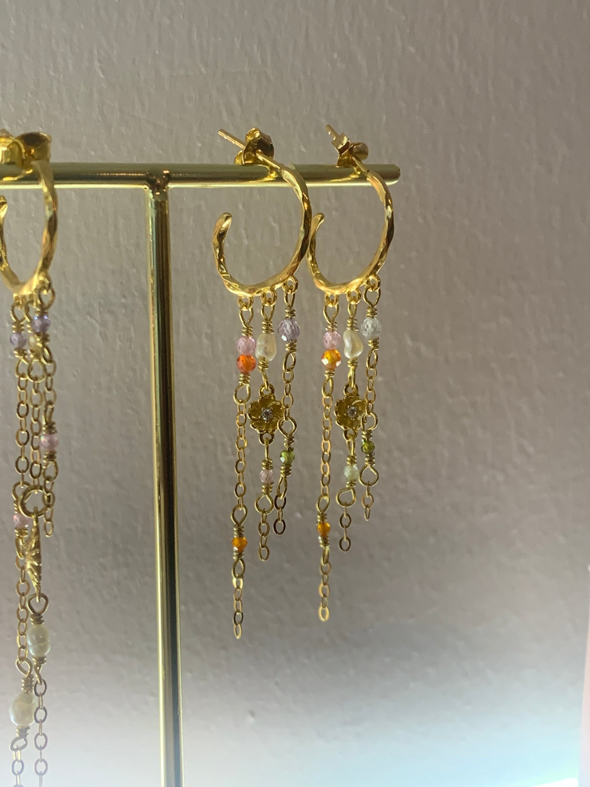Under blomsten falder de lette kæder smukt og bevæger sig elegant med dig. De er pyntet med ægte ferskvandsperler og små kubiske zirconia, som tilsammen skaber et raffineret spil mellem glans, lethed og luksus. Kombinationen giver øreringene et eksklusivt udtryk, der både kan bæres til hverdag og til særlige øjeblikke.